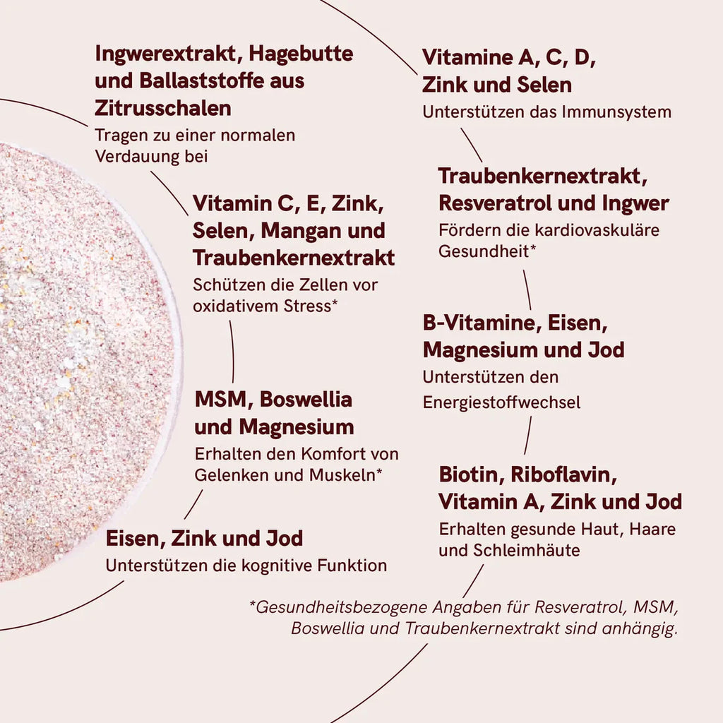 Inhaltsstoffe: Vitamine und Mineralstoffe, veganer Kollagen-Aminosäuren-Komplex, Zitrusfasern, MSM, Epicor®, Hefefermente, Hagebuttenextrakt, Rutin, Traubenkernextrakt, Resveratrol, Zimt-Extrakt, Ingwer-Extrakt, Boswellia-Extrakt, Lactospore®, Bioperine®, Rote-Bete-Pulver, Sonnenblumenlecithin, Maltodextrin, DL-Äpfelsäure, Zitronensäure, Stevia, natürliches Waldfruchtaroma