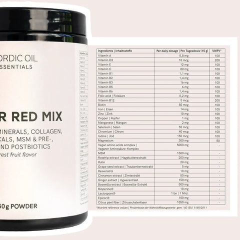 Super Red Mix ist ein hochwertiges All-in-One-Nahrungsergänzungsmittel, das essentielle Vitamine, Mineralstoffe und pflanzliche Wirkstoffe liefert – zur umfassenden Unterstützung Ihres Wohlbefindens im Alter. Die Rezeptur kombiniert über 30 wissenschaftlich geprüfte Inhaltsstoffe, die gemeinsam das Immunsystem stärken, die Verdauung fördern und oxidativem Stress entgegenwirken – alles mit einem Löffel täglich.