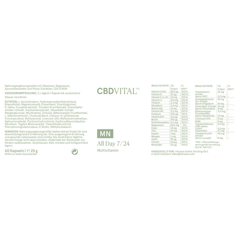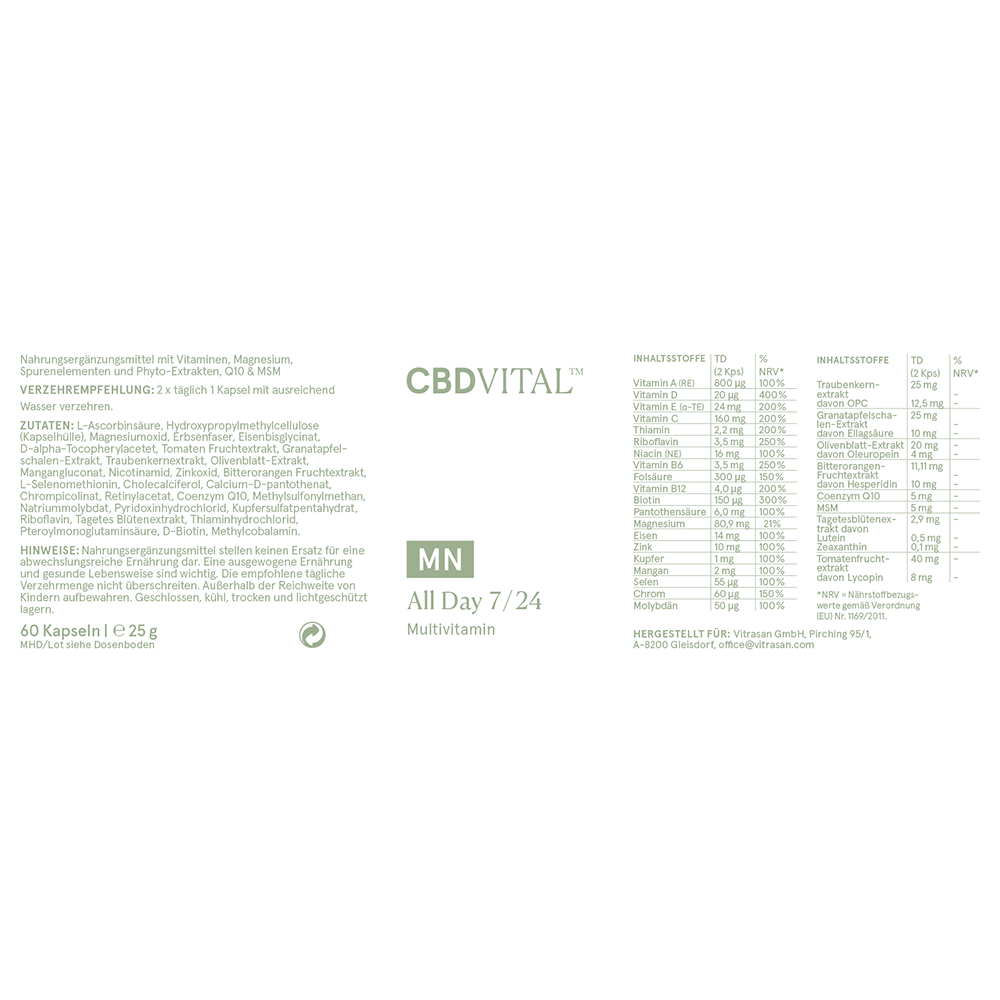 CoQ10, Lutein und OPC aus Traubenkernen haben antioxidative und damit zellschützende Eigenschaften. Neben Carotinoiden und Citrusbioflavonoiden enthalten die CBD VITAL Multivitamin Kapseln, Extrakte aus Granatäpfelschalen, Olivenblättern und Bitterorangen, die ebenso besonders wertvolle Antioxidantien liefern.