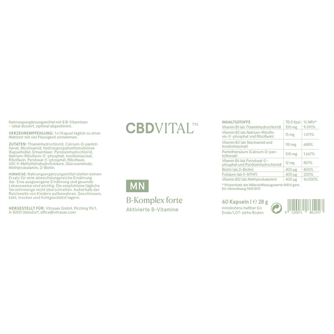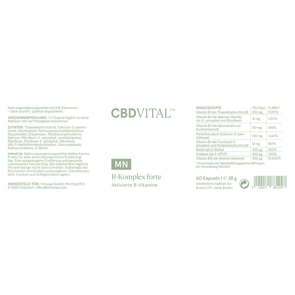 Das B-Komplex forte besteht aus allen 8 essenziellen B-Vitaminen, die in einem ausgewogenen Verhältnis ihre synergistischen Eigenschaften optimal entfalten können. Aktivierte Verbindungen und ideale Dosierungen sorgen für eine optimale Aufnahme im Körper und eine hohe Effektivität der Vitalstoffe.