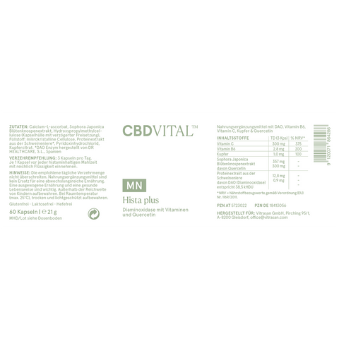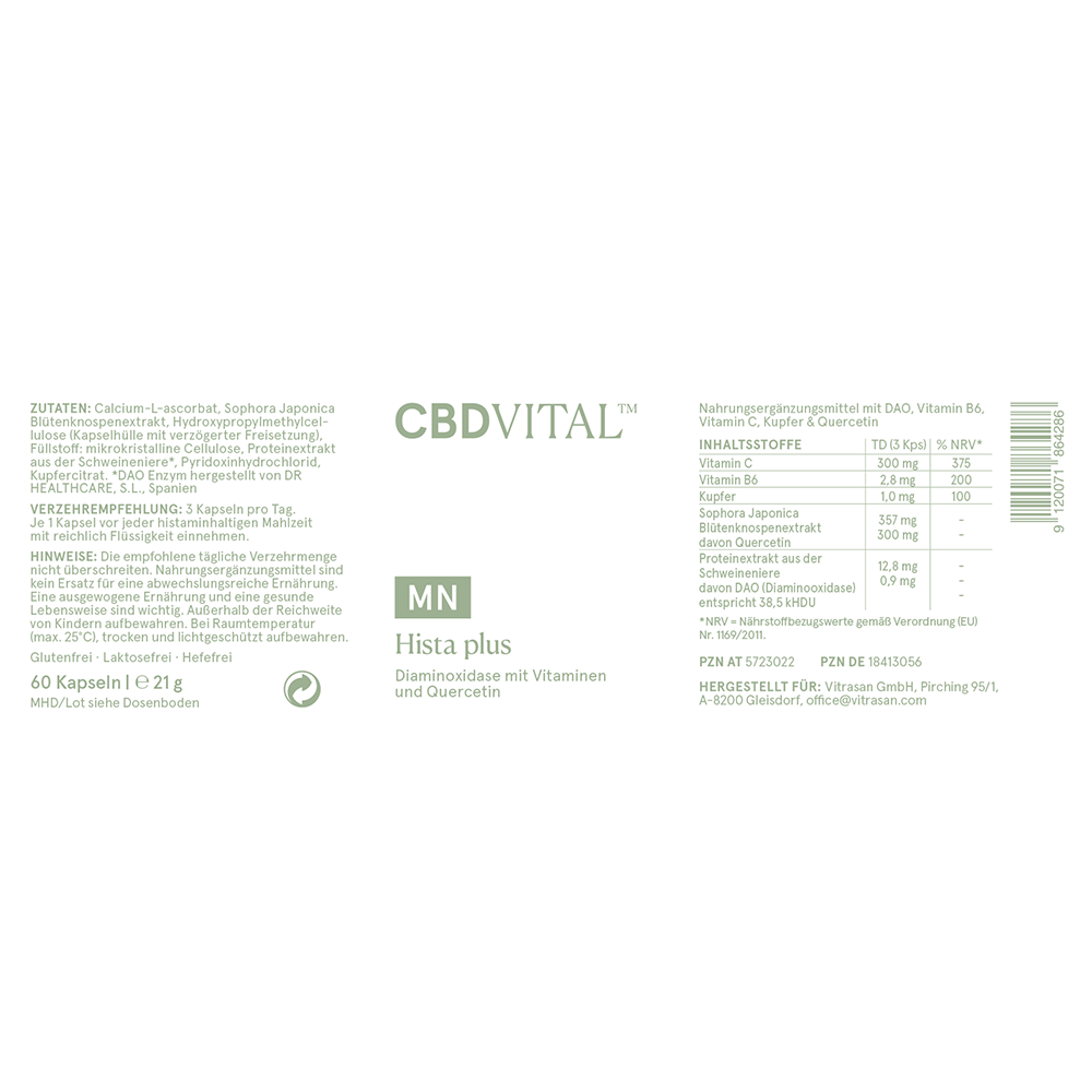Hista plus ist das erste Nahrungsergänzungsmittel, welches neben dem Histamin-abbauenden Enzym Diaminooxidase (DAO) auch die notwendigen Co-Enzyme zur Aktivitätssteigerung sowie Vitamin C und Quercetin liefert. So kann ein erhöhter Histaminspiegel natürlich harmonisiert werden. Die Aktivität des Histamin-abbauenden Enzyms kann durch bestimmte Co-Faktoren wie z.B. Vitamin B6 und Kupfer aktiviert werden. Weitere orthomolekulare Möglichkeiten wie die Zufuhr von Vitamin C oder der sekundäre Pflanzenstoff Quercetin können überschießende Histaminspiegel durch die stabilisierende Aktivität auf die Mastzellen natürlich unter Kontrolle halten.