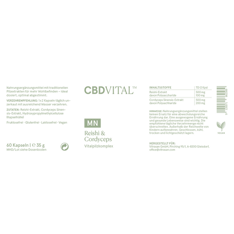 Zutaten: Reishi-Extrakt, Cordyceps Sinensis-Extrakt, Hydroxypropylmethylcellulose (Kapselhülle)