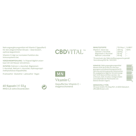 Zutaten: Calcium-L-ascorbat, Magnesium-L-ascorbat, Natrium-L-ascorbat, Überzugsmittel: Hydroxypropylmethylcellulose (Kapselhülle).